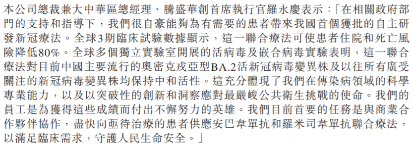 另一边,腾盛博药在公告中也提到,安巴韦单抗/罗米司韦单抗可使新冠患者住院和死亡风险降低80%,对于中国主流流行的Omicron BA.2突变株及以往所有受关注的突变株均保持中和活性。