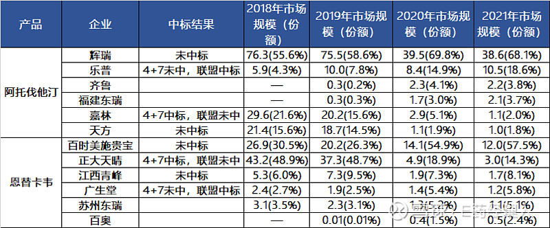 阿托伐他汀和恩替卡韦国采后相关厂家市场规模(亿元)及市场份额变化