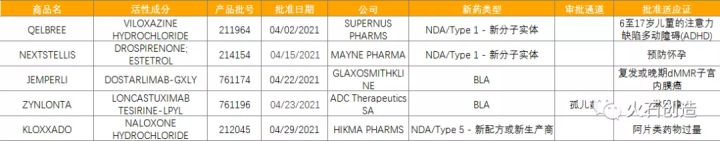 表1:2021年4月FDA批准NDA/BLA药物列表