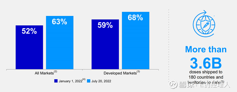 下半年,辉瑞业绩的增长动力或许依然主要来自于新冠疫苗以及新冠药物。从数据来看,截至2022年7月20日,超过36亿剂Comirnaty已经覆盖了180个国家和地区。辉瑞对新冠疫苗Comirnaty2022年全年设定的销售目标是320亿美元。继Comirnaty由FDA获批用于 12至 15 岁的青少年后,辉瑞和 BioNTech进一步加深合作,包括拓展适应人群至6个月至5岁以下儿童。同时,还开发了针对BA.1和BA.4/BA.5的单价及双价候选疫苗,目前其中一款已经向欧盟EMA递交了上市申请。辉瑞表示,如果获批的话,新的疫苗将在秋季向公众提供。