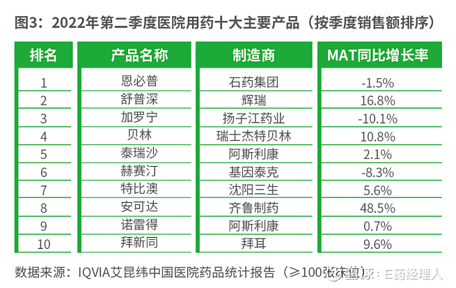 从产品的季度销售额来看,石药的恩必普超越辉瑞的舒普深跃升至第一位,舒普深和扬子江药业的加罗宁分列第二、第三位。相对于第一季度,排名前10的产品,依旧是6款产品来自跨国企业,4款来自于本土企业。齐鲁制药的安可达(贝伐珠单抗)持续保持两位数的增长,以48.5%的MAT同比增长率再次进入前十。