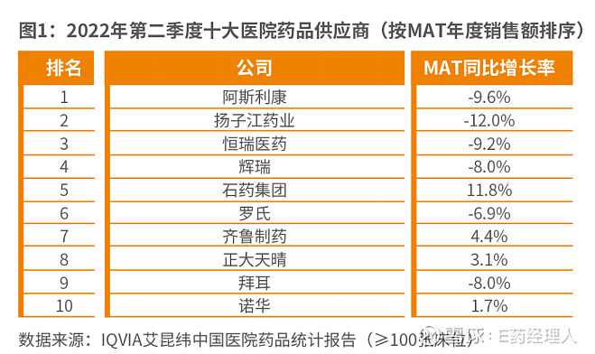 与去年同期不同的是,辉瑞的舒普深(注射用头孢哌酮钠舒巴坦钠)MAT同比增长率高达16.8%,而去年同期,舒普深下滑了1.1%。但从MAT年度销售额角度,辉瑞却下滑了8%,在跨国药企中幅度仅小于AZ。罗氏也同样如此,不仅MAT年度销售额下滑了6.9%,在十大医院药品供应商排名中也由上年同期的第五名下滑到了第六名。