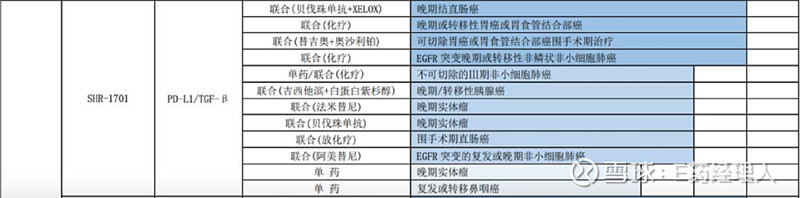 PD-L1/TGF-β双抗SHR-1701有12项适应证在研,其中晚期结直肠癌、晚期或转移性胃癌或胃食管结合部癌、可切除胃癌或胃食管结合部癌围手术期治疗以及EGFR 突变晚期或转移性非鳞状非小细胞肺癌等4项适应证进行到了临床III期。