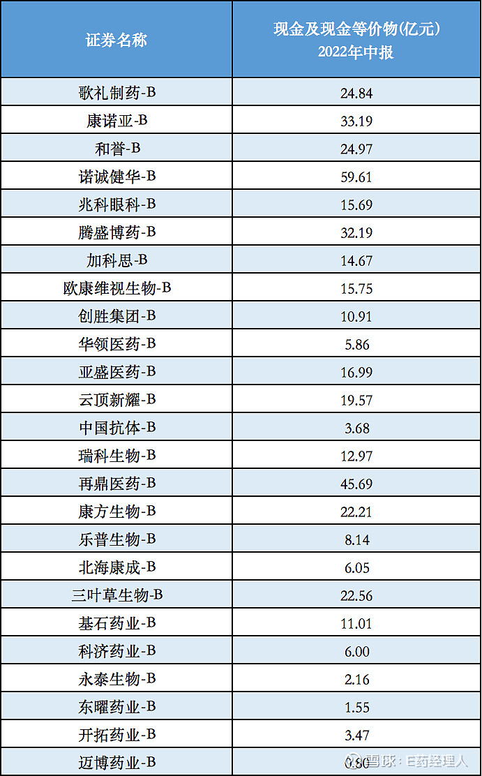 E药经理人统计,截至2022年8月30日,32家港股18A未盈利生物医药企业中有25家发布了半年报,按照现金及现金等价物口径计算,有4家企业超过了30亿元,16家企业超过10亿元。与2021年年报中披露现金及现金等价物相比,仅有4家企业实现了增长,其余21家都有所减少。