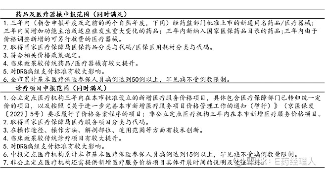 2022年7月13日,北京市医保局发布《关于印发CHS-DRG付费新药新技术除外支付管理办法的通知(试行)》,旨在发挥DRG引导规范医疗行为的同时,激发新药新技术创新动力,提出新药新技术可不纳入DRG,申请范围包括独家新药、临床效果提升较大、对DRG病组支付标准有较大影响、参保人员病例达到50例以上的药物/器械/诊疗项目。