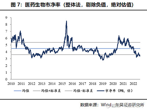 截至2022年8月底,医药生物市盈率为23.94倍,远低于2010年以来的历史平均水平37.20倍,处于1.17%的历史分位;当前医药生物市净率为3.41倍,同样远低于历史平均水平4.49倍,处于8.09%的历史分位水平。当前估值水平同样处于2010年以来的低位水平。