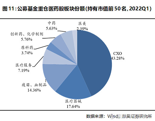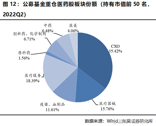 从基金重仓持股市值前五十名的结构看,2022Q2CXO板块仍为医药重仓股第一位,市值占比达35.42%,但份额大幅下降,相比2022Q1的43.28%环比下降7.85%,医疗服务板块份额上升至第二,达18.39%,环比上升11.20%;医疗器械板块份额则下降至第三,为15.76%,环比下降1.89%;其余板块如疫苗和血制品份额为11.61%(-2.75%),创新药与化学制剂份额为6.71%(+0.95%),中药份额为6.48%(+0.85%),医美份额为4.06%(+1.67%),原料药份额为1.56%(-2.18%)。