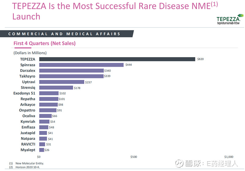 通过并购,Horizon获得了其最有潜力的重磅产品Tepezza,以及一系列罕见病产品,并开启了商业化。随着规模扩张,Horizon将公司名称从Horizon Pharma修改为Horizon Therapeutics。