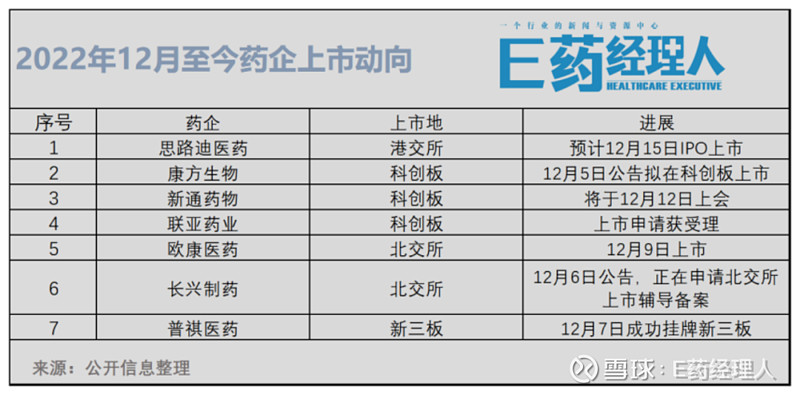 据E药经理人不完全统计,单12月份过去的这一周,有IPO新动态的药企就不在少数。康方生物将在科创板二次上市;思路迪医药预计12月15日在港交所IPO上市;欧康医药、华海药业子公司长兴制药纷纷欲登北交所……港交所、科创板、北交所、新三板百花齐放,好消息屡屡传来。