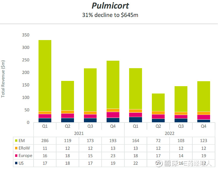 转折从2020年开始,一方面遭受竞品的挤压,另一方面遇到了集采。2020年底,吸入用布地奈德进入第四批集采名单,集采后销售额大幅下降。从其披露的财报中也可看出,从2021年Q1到Q2,销售额砍半不止,之后有所回升。