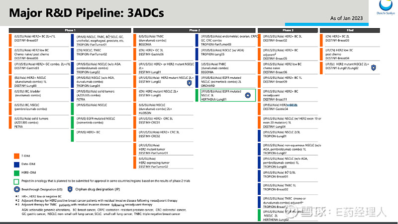 AZ在2019年从第一三共BD而得的HER2 ADC药物Enhertu在2022年取得了6.02亿美元的全球收入(其中AZ销售收入为7900万美元),增长也达到了182%,已经预订了未来重磅炸弹的席位。2020年与第一三共合作的另一款Trop2 ADC药物Dato-DXd也在三阴乳腺癌领域表现出了优秀的疗效,该疗法目前正在乳腺癌和肺癌两大领域扩张,