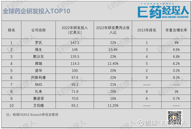全球药企研投TOP10十年变迁:罗氏9年夺冠,AZ一骑绝尘,默沙东扭转,GSK、安进消失在榜单
