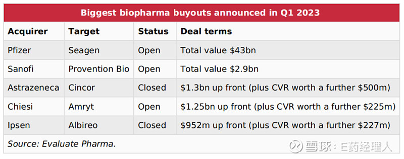 以收/并购为例,浮入眼帘的还是3月那场“辉瑞430亿美元收购ADC龙头Seagen”一度引发国内外关注,并在第一季度占据并购市场主导地位。除去这笔巨额交易,第一季度其余交易规模均较小,在第一季度的收购支出仅为88亿美元,交易量与去年几乎持平,且存在巨大的估值差距。