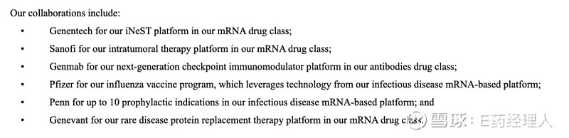 例如对于礼来、基因泰克、Genmab和赛诺菲等在抗肿瘤领域强势的公司来说,BioNTech与其合作主要基于公司的mRNA、iNeST、TCR等平台,由对方支付首付款和相关里程碑。